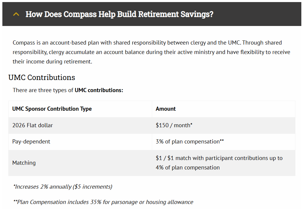 Effective January 1, 2026, UMPIP clergy personal contributions will be replaced with the new pension program, Compass. Compass is a retirement plan administered by Wespath Benefits and Investments. Like UMPIP, a pastor may choose to have an amount withheld from his/her salary and sent to Wespath for investment in their Compass account on a tax-deferred basis (or they may choose after-tax contribution; see line X). Pastors will receive a $1 for $1 match from the local church on up to 4% of the clergy’s compensation. It is important to note, all pastors will be defaulted at a 4% tax-deferred with the option to increase/lower the contribution, if preferred. It is highly encouraged for pastors to contribute 4% to maximize their retirement benefit by receiving the full possible match.