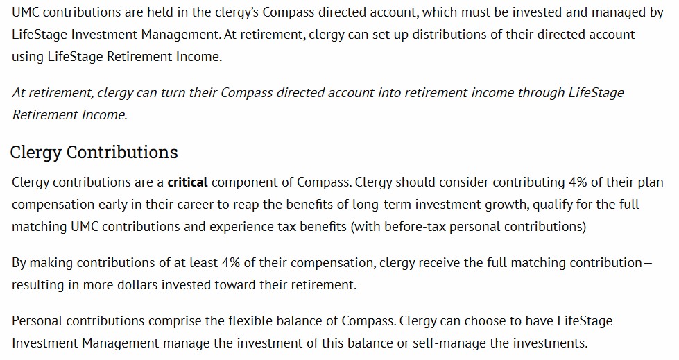 Under the new Compass pension plan, local churches are required to contribute a $1 for $1 match on up to 4% of the clergy’s compensation. In addition to payroll contributions, Compass includes a “student loan” provision. Many clergy carry student loan debt, which can make it difficult to pay back the loan and contribute to their retirement account. To address this, through Compass, the UMC provides matching contributions up to 4% of compensation based on qualified educational loan payments made by clergy. In other words, the plan matches student loan payments as if they were participant contributions into Compass.